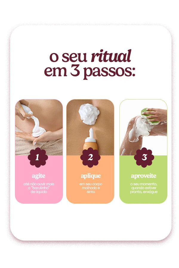 Aplique na pele úmida. Espalhe devagar, curtindo a espuma cremosa tipo chantilly e o cheirinho que toma conta do banho.